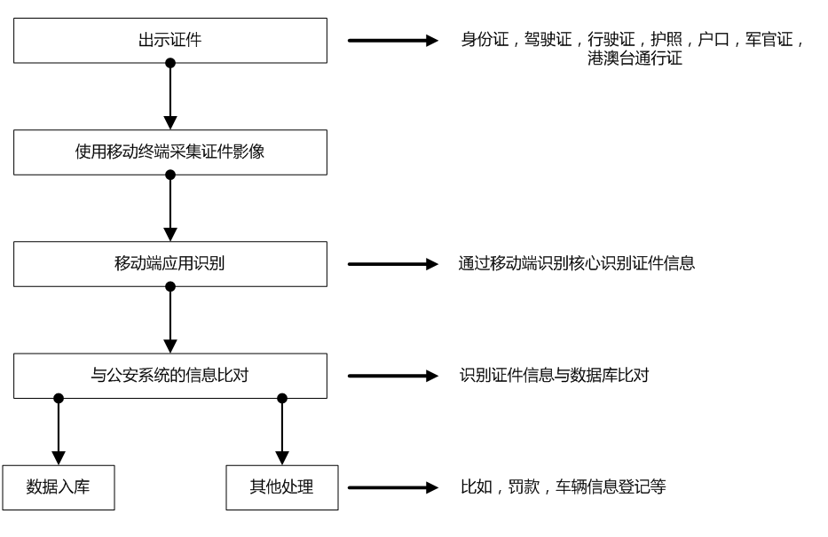 在警务办公当中,通过移动终端(智能手机,平板,智能手持终端)的应用采集身份证和车牌影像和信息,自动识别并录入,通过网络(2G,3G,4G,WIFI)上传到警务系统的服务器,业务流程图见图-1,数据系统网络拓扑图见图-2,系统实施样例图见图-3: