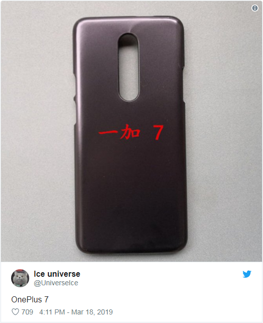 除此之外,有一张所谓的一加 7 后保护壳照片,显示该机后置三摄的开孔布局,隐约可以看到的顶部开孔也暗示了该机前置弹出式自拍摄像头,底部显然并没有预留 3.5mm 耳机插孔。