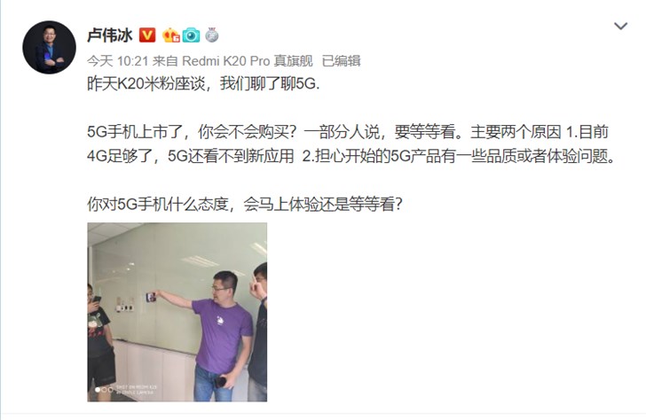 小米集团副总裁 红米Redmi 品牌总经理@卢伟冰 今日早间发微博称,“昨天K20米粉座谈,我们聊了聊5G。5G手机上市了,你会不会购买?一部分人说,要等等看。主要两个原因:1、目前4G足够了,5G还看不到新应用;2、担心开始的5G产品有一些品质或者体验问题。”