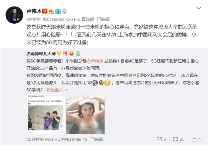 小米卢伟冰怒怼网友歪曲其5G相关言论:用心险恶