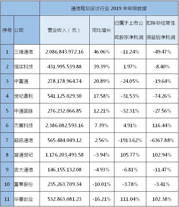 在营业收入普遍增长的同时,通信规划设计行业竞争加剧,净利润出现下滑,世纪鼎利、恒实科技、中通国脉等多家上市公司上半年营业收入与净利润出现“冰火两重天”。鉴于5G广阔的发展前景,行业经历业绩“阵痛”后,未来主动拥抱变化的公司将分享到更大的蛋糕。