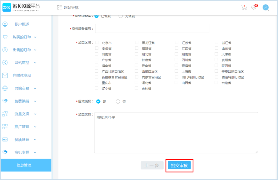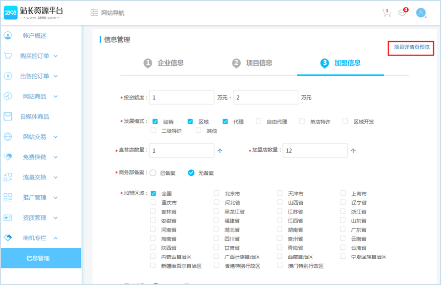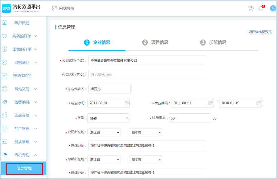 第一步:注册登录账号,在【会员中心】-【商机专栏】-【信息管理】按顺序填写企业信息、项目信息、加盟信息。