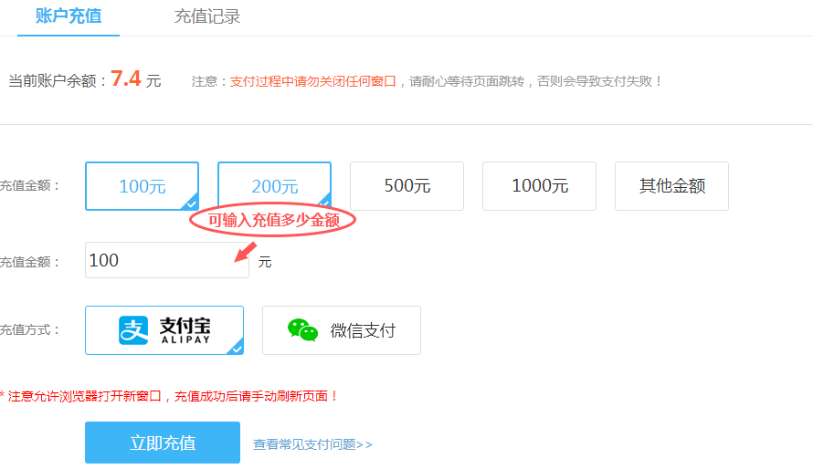 2.充值过程中无法打开支付页面时,请注意允许浏览器打开新窗口。充值成功过手动刷新页面。