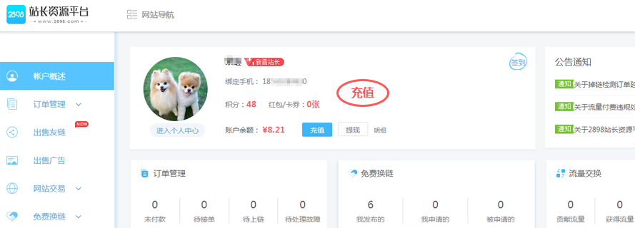 第一步:登录会员中心,在账户概述页面点击【充值】按钮 进入充值页面